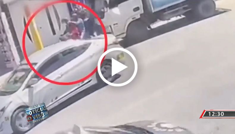 En la otra perspectiva de la cámara, se puede ver cuando los asaltantes, tras salir del lugar y subirse a la motocicleta, el mismo camión blanco al cual la señora le hacía señas de desesperación, los impacta desde la parte de atrás, botándolos a los tres.