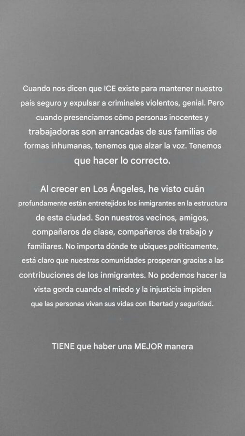 “Cuando nos dicen que ICE existe para mantener nuestro país seguro y expulsar a los criminales violentos, es fantástico. Pero cuando presenciamos cómo personas inocentes y trabajadoras son arrancadas de sus familias de formas inhumanas, tenemos que alzar la voz. Tenemos que hacer lo correcto”, escribió Kardashian.