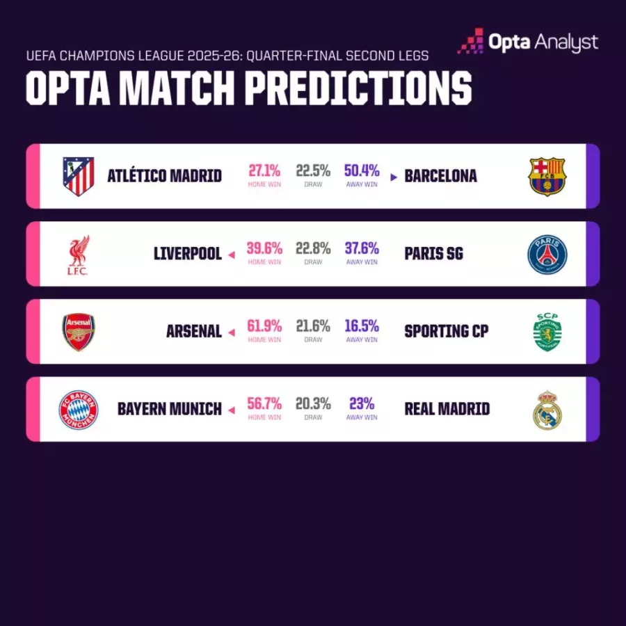 El español Atlético de Madrid, el francés PSG, el inglés Arsenal y alemán Bayern Munich parten con ventaja tras haber ganado la semana anterior. Pero aún no hay nada definido en ningún partido. Y la supercomputadora Opta, centro de análisis deportivo potenciado con IA, no descarta ningún resultado. Sin embargo, tiene claros favoritos para pasar a semifinales.