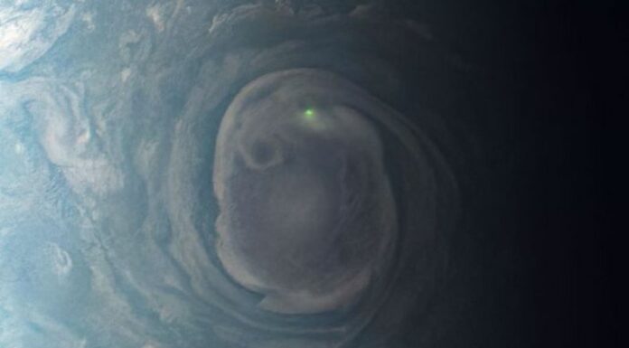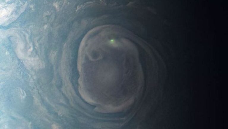 «Nuestra nave espacial Juno observó el brillo de un rayo en un vórtice cerca del polo norte de Júpiter. Juno capturó esta vista el 30 de diciembre de 2020 desde unas 19.900 millas (32.000 kilómetros) sobre las nubes de Júpiter mientras se acercaba al planeta«.