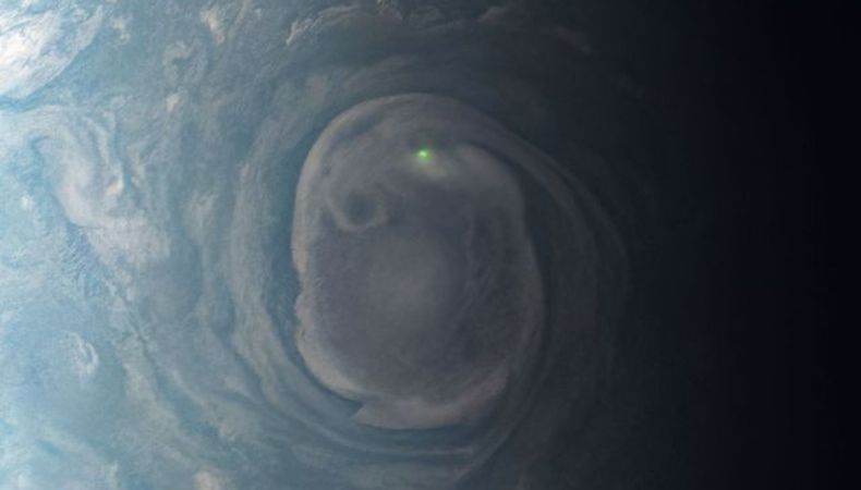 La nave espacial Juno, de la NASA, captó una curiosa luz verde cerca del polo norte de Júpiter, mientras se acercaba al planeta. La increíble instantánea corresponde al 30 de diciembre de 2020, y se capturó a aproximadamente 32,000 kilómetros (19,000 millas) de las nubes del astro.