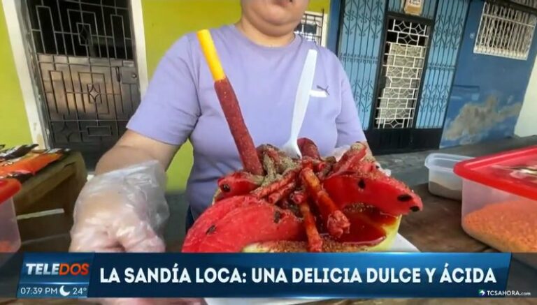 «Es la mitad de la sandía, le lleva las rodajas de la sandía, le agregamos salsas y una pajilla de tamarindo», comentó Yamileth de Anaya, una de las creadoras del peculiar postre.