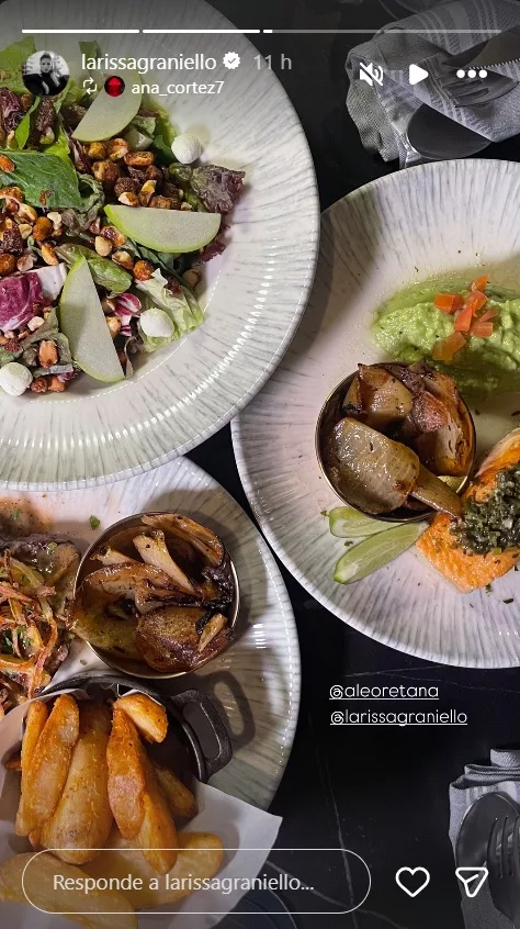 El primer punto fue la comida. La salida incluyó una experiencia gastronómica que fue parte central del recorrido. En las imágenes se observan varios platillos servidos en la mesa: una ensalada con frutas y frutos secos, salmón acompañado de puré, vegetales salteados y papas rústicas.