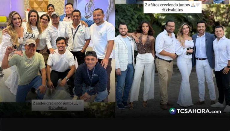 En otra foto, con un grupo más amplio del equipo técnico, cámaras y luces de grabación de fondo, el mensaje fue: “2 añitos creciendo juntos 🙏🤍 @vivalmtcs”.