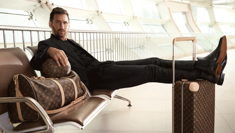 Leo relajó las piernas sobre una maleta con el logo de la firma francesa que fue dundada por el diseñador Marc Newson. En la postal se le ve con un bolso de viaje y una infaltable pelota de fútbol.