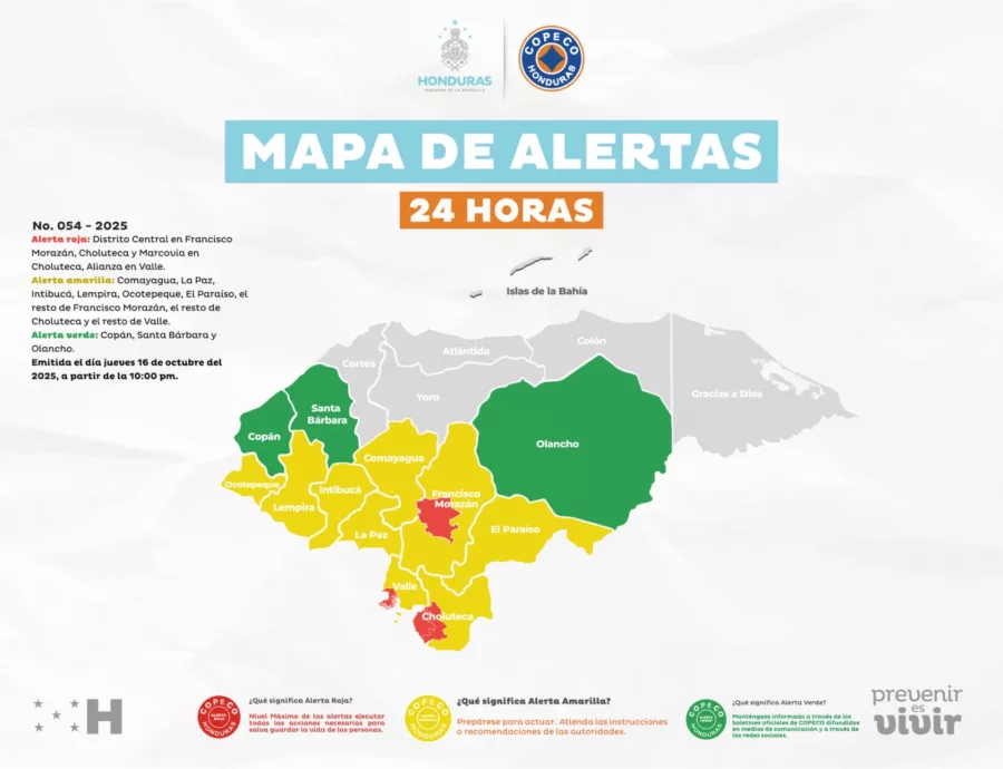 Además, se mantiene alerta amarilla en los departamentos de Comayagua, La Paz, Intibucá, Lempira, Ocotepeque, El Paraíso, así como en las áreas restantes de Francisco Morazán, Choluteca y Valle.