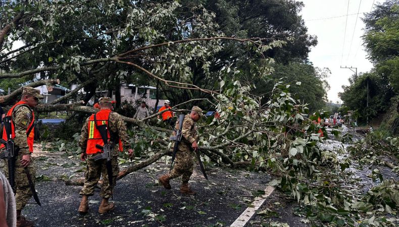 Las fuertes lluvias que se han registrado esta tarde en distintos puntos del país. Elementos de la Fuerza Armada realizan remoción de árbol caído en la calle que conduce hacia el cantón La Coyotera, El Paraiso, Chalatenango.