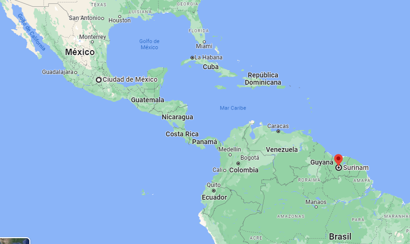 Su nombre oficial es República de Surinam. La capital es Paramaribo. Tiene una extensión territorial de 163,821 kilómetros cuadrados, unas 8 veces más grande que El Salvador. Surinam es el país más pequeño de Sudamérica continental en superficie. Se ubica entre Guayana Francesa, Guyana y Brasil. Y tiene costa en el océano Atlántico.