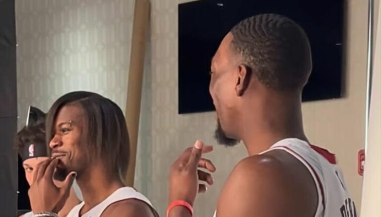 La reacción de Adebayo al estilo de Butler: otro de los grandes momentos fue la presencia de Jimmy Butler, que logró quedarse con el foco de las miradas, por su nueva apariencia; en quien, se registraron evidentemente muchos cambios.