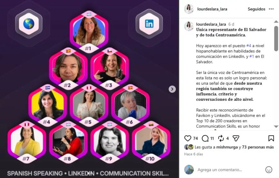 Lourdes Lara ya había sido reconocida recientemente en otro ranking internacional, por lo que este nuevo resultado refuerza su posicionamiento como una de las voces salvadoreñas más influyentes en comunicación dentro del entorno digital.