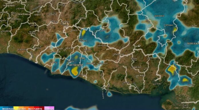 En la zona central de Chalatenango también hay tormenta, y gran concentración de actividad eléctrica en los alrededores de la cordillera del Bálsamo, en La Libertad y San Salvador.