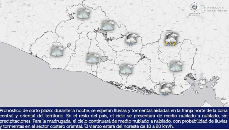 La cuenta oficial del MARN, como pronóstico a corto plazo, ha mencionado que, durante la noche, se esperan lluvias y tormentas aisladas en la franja norte de la zona central y oriental del territorio.