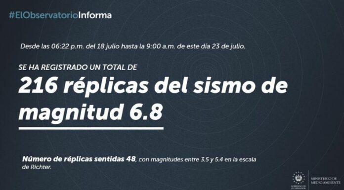 Desde que sucedió el sismo de magnitud 6.8 en territorio nacional, el pasado martes, el MARN registra 219 réplicas hasta las 9:00 a. m. de este día. De las cuales, 48 han sido percibidas por la población, con magnitudes que oscilan entre los 3.5 y 5.5.