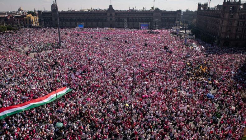 Bajo la consigna «Mi voto no se toca», una multitud vestida de blanco y rosa, los colores que identifican al Instituto Nacional Electoral (INE), llenó gran parte del paseo y varias calles aledañas del centro histórico de la capital.
