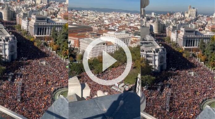 Según la administración española, se congregaron en la plaza Cibeles, en pleno centro de la capital, entre una marea de banderas españolas y europeas, en respuesta a una convocatoria apoyada por la oposición conservadora.