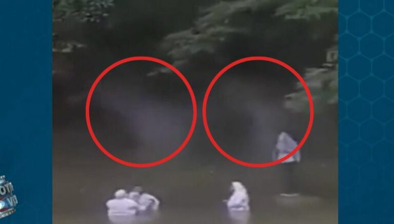 Como se puede ver, hay unas personas vestidas de blanco en el cauce del río, llevando a cabo la práctica. En un momento determinado, se hacen presentes unas aparentes sombras blancas, casi difuminadas, sobre sus cabezas. Sin embargo, no parecen darse cuenta de la misteriosa manifestación.