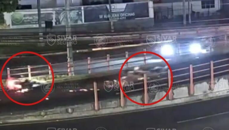 Durante horas de la noche de ayer, las cámaras de videovigilancia de la Alcaldía de San Salvador captaron la secuencia de un grave accidente de tránsito entre dos motociclistas en el bulevar Los Próceres, específicamente, en el paso a desnivel monumento Hermano Bienvenido a Casa, San Salvador.