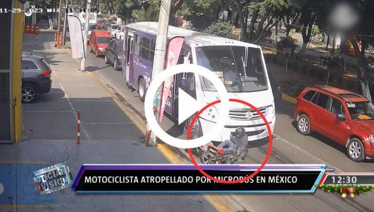 Como se puede apreciar en la grabación, un motociclista pierde el equilibrio mientras se conduce y cae en el pavimento. Para mala fortuna, queda justo enfrente de un autobús del transporte colectivo, y en una posición que, aparentemente, el conductor de la unidad no logró ver.