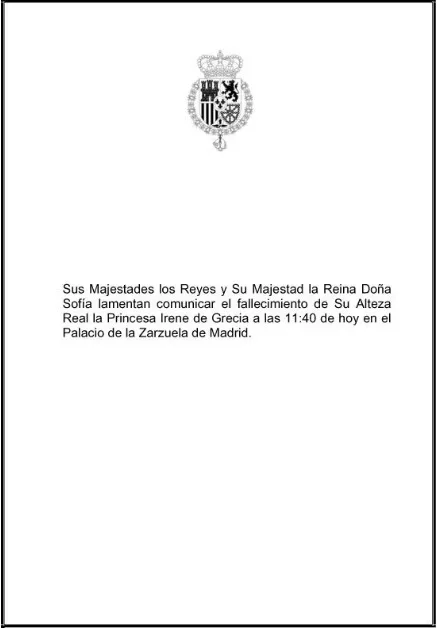 El comunicado señala que “Sus Majestades los Reyes y Su Majestad la Reina Doña Sofía lamentan comunicar el fallecimiento de Su Alteza Real la Princesa Irene de Grecia”. En las próximas horas, la Casa Real informará sobre el velatorio en España y trasladará el féretro a Grecia, donde la enterrarán en el cementerio de Tatoi.