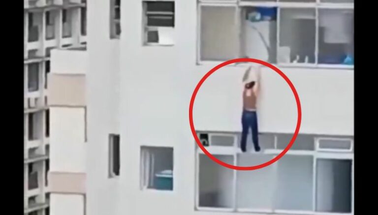 A través de un video se observó que el ciudadano, puso en riesgo su vida. Tras salir por la ventana de su apartamento para recibir al canino y varios elementos personales. Luego, ella se cuelga de la estructura, el hombre la sostiene de las piernas y logra entrarla al apartamento.