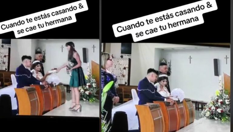 Una feliz pareja se encontraba en la iglesia llevando a cabo su matrimonio y en medio del desarrollo de la ceremonia, ocurrió algo bastante inusual y es que, una joven, al momento de entregar un objeto relacionado con la boda, perdió el equilibrio y cayó tras bajar una grada.
