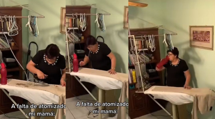 El audiovisual fue publicado por el usuario identificado como @nasgult18, quien describió la situación con un divertido encabezado: “a falta de atomizador. Mi mamá”. Ya que, en las imágenes, se ve que la señora bebe un sorbo de agua antes de rociarla directamente hacia las prendas, desde su boca.