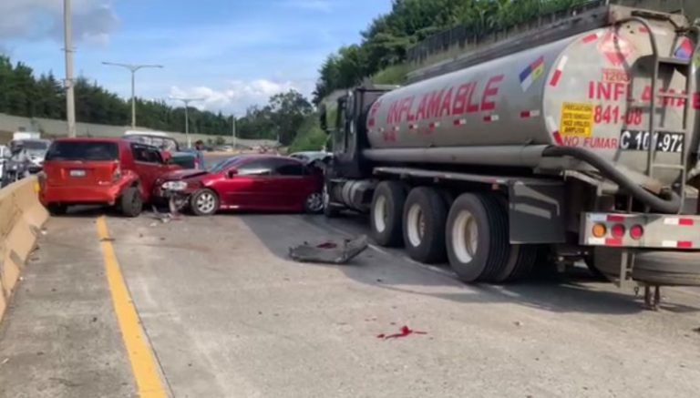 De acuerdo con la información, una pipa que transporta combustible presentó fallas en su sistema de frenos. El accidente se registró sobre los carriles que conducen hacia el bulevar Los Próceres en San Salvador. El paso se encuentra cerrado en la zona. Hasta el momento no se reportan lesionados, solo daños materiales.