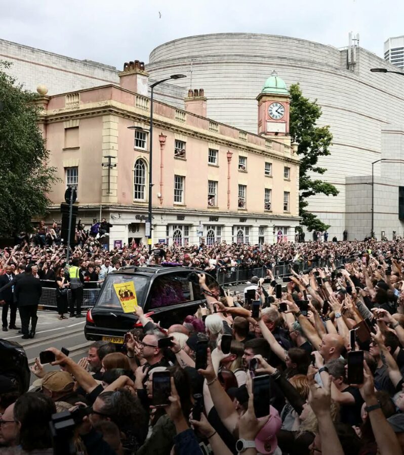El cortejo inició a la 1:00 p.m. (hora de Inglaterra) sobre Broad Street, una de las avenidas más representativas de Birmingham. El ataúd del cantante fue trasladado en un coche fúnebre adornado con flores moradas que formaban la palabra “Ozzy”, mientras una caravana de vehículos con sus familiares lo acompañaba. A los costados, seguidores coreaban su nombre y lanzaban flores a su paso.