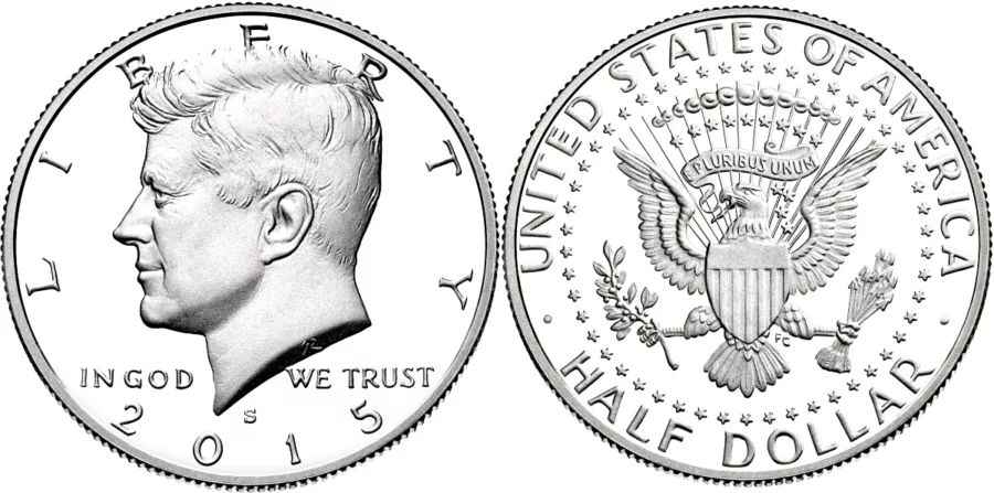 Mientras que la moneda de 50 centavos muestra, por un lado, al presidente John F. Kennedy, y en el reverso un águila con el escudo, flechas y una rama de olivo.