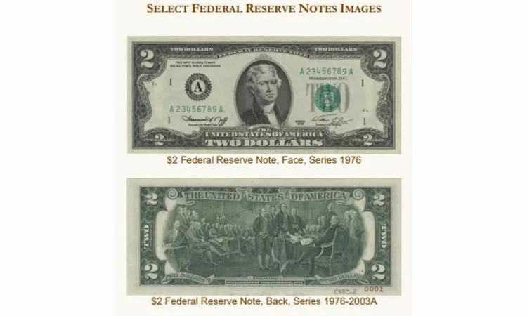 El billete de 2 dólares tiene en un lado al presidente Thomas Jefferson, y en el reverso la representación de la firma de la Declaración de Independencia de Estados Unidos.