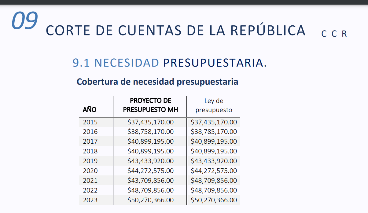 Ocurre lo mismo con el Tribunal de Ética Gubernamental ($3,201,901), la Corte de Cuentas de la República ($50,270,366), y la Corte Suprema de Justicia ($443,241,440).