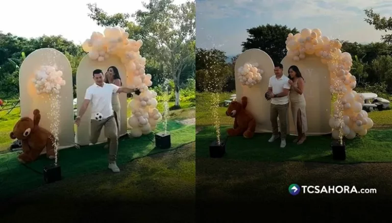 El momento fue publicado en redes sociales a través de un video, donde ambos aparecen en una celebración al aire libre, acompañados de familiares y amigos. La decoración incluyó tonos beige y blanco, con arcos, globos y un oso de peluche.