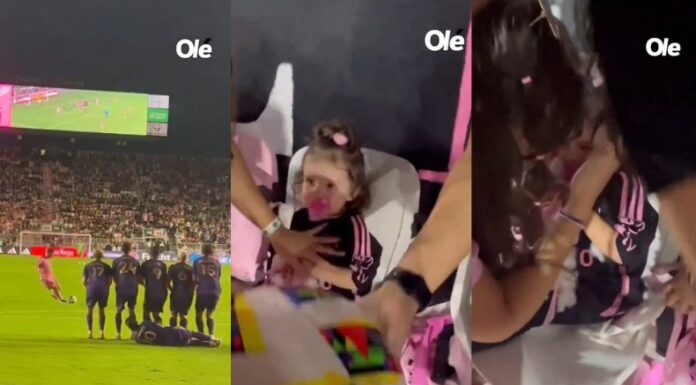 La acción ocurre después de que la «Pulga» lanzara un tiro libre arriba de la portería rival. Sin querer, el balón cae justo donde se encontraba una niña en las gradas del estadio.