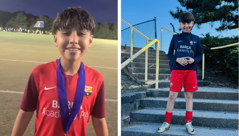 Un pequeño niño salvadoreño juega en las canteras del Barcelona, Mateo, menciona que su sueño es jugar en Europa.