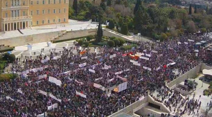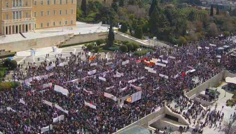 En Atenas, unas 28,000 personas, según la policía, se congregaron ante el Parlamento griego para reclamar que se encuentren a los verdaderos culpables de la tragedia.