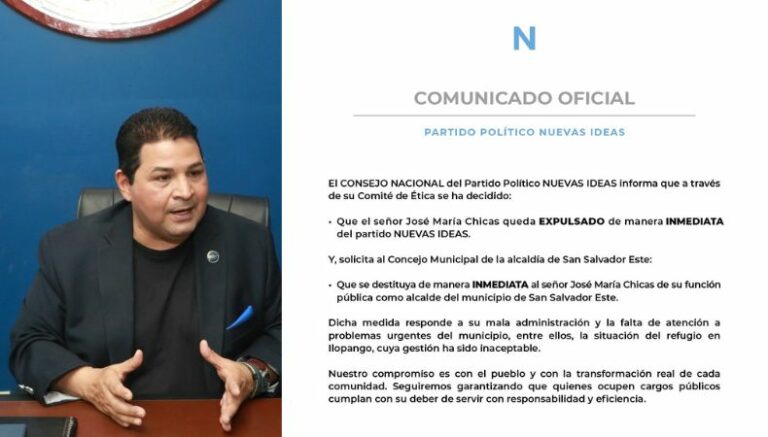 Este sábado 8 de marzo, el partido político Nuevas Ideas anunció la expulsión inmediata de José María Chicas de sus filas, así como la solicitud de su destitución como alcalde del municipio de San Salvador Este, compuesto por los populosos distritos de Ilopango, San Martín, Soyapango y Tonacatepeque.