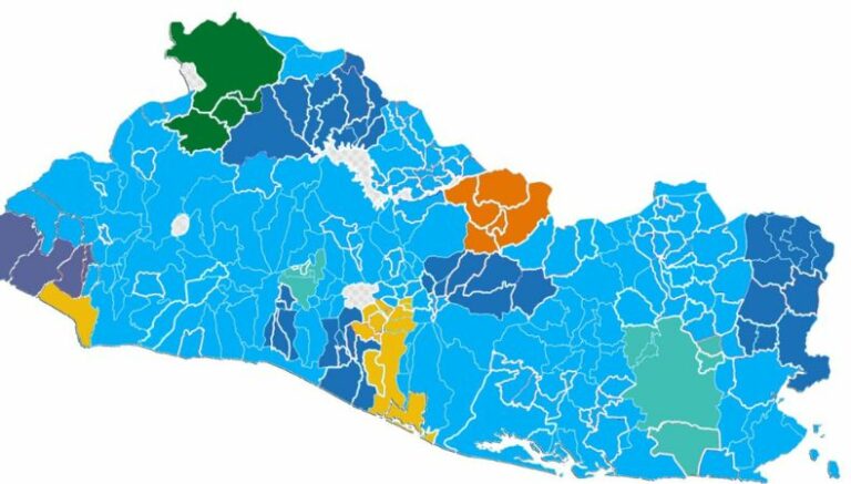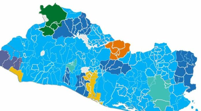 FMLN, PCN y Vamos no lograrían ninguna municipalidad. En la zona occidental, central y oriental, Nuevas Ideas se lleva la mayor cantidad de votos. En la primera obtendría 235,907 en ocho municipios, en la segunda 486,431 en 16 alcaldías, y en la tercera 136,082 en ocho municipios.