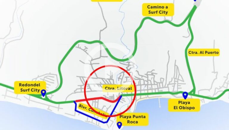 En el mapa, además, se puntea que el tránsito vehicular será con normalidad en el tramo de la carretera el Litoral, desviándose a la altura de la playa El Obispo, tomando la carretera al Puerto de La Libertad, siguiendo por el Bypass Surf City; pasando camino Surf City hasta llegar al Redondel que lleva el mismo nombre. Esta es la ruta más larga, pero es otra de las opciones de viaje si circula por esta zona.