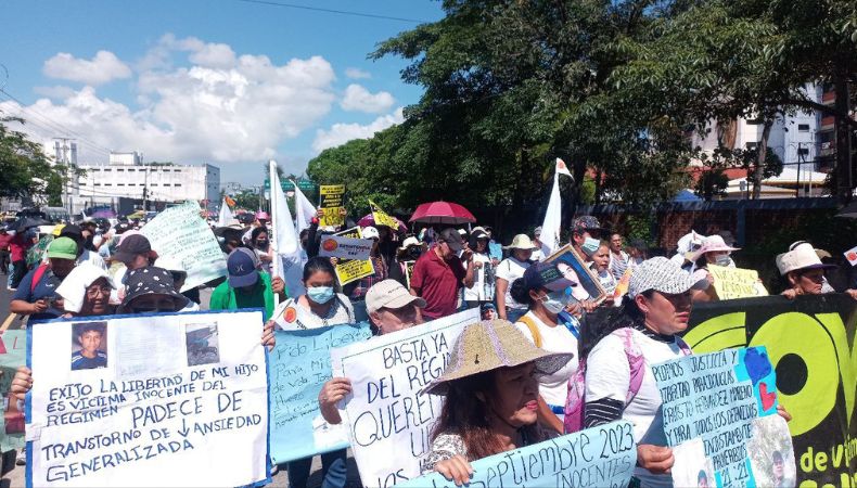 Además, la marcha se debe al rechazo al régimen de excepción, el cual, aseguran, que viola los derechos de las personas que no cometieron delitos y el derecho del pueblo a actuar libremente. Norma Argueta, es madre de un hijo capturado, y marcha para que pueda ser liberado.