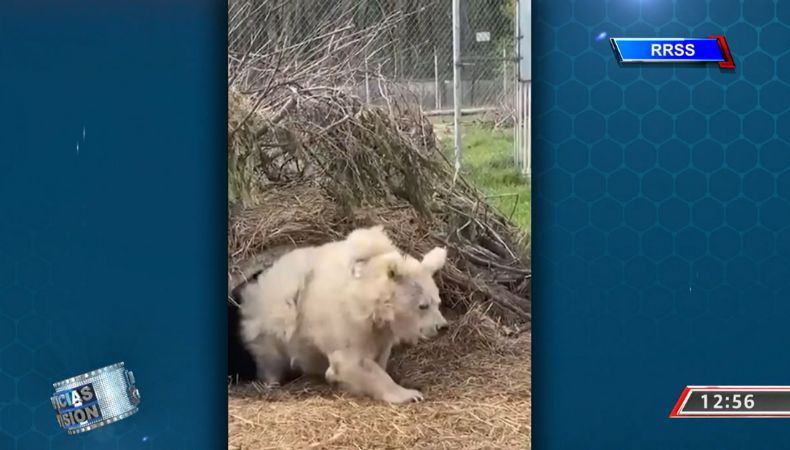 El oso sale muy despacio, observa su alrededor, su pelaje es color blanco y está totalmente despeinado. Los mamíferos suelen estar en periodo de hibernación cada año, que dura entre cinco y siete meses.
