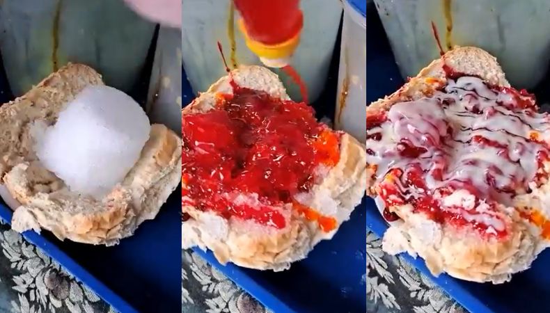 El cual, consiste en literalmente un pan francés, con hielo picado encima, y todos los implementos que lleva una minuta: jarabes de sabor, jalea de tamarindo y leche condensada.