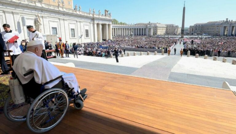 El papa Francisco, convaleciente tras su larga hospitalización por una doble neumonía, apareció por sorpresa este domingo en la Plaza de San Pedro en el Vaticano. El pontífice argentino en silla de ruedas y con cánulas nasales de oxígeno bendijo a los fieles congregados en la plaza.
