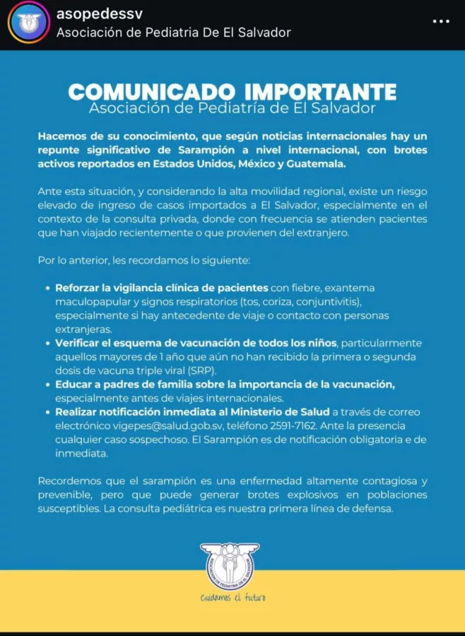 «El sarampión ha sido un riesgo desde 2024, México y Estados Unidos están con brotes intensos de sarampión que no se han podido contener… pero la cercanía con Guatemala nos ha hecho ver más de cerca tener mucho más el riesgo», dijo la doctora Lourdes Dueñas, pediatra, infectóloga y vicepresidenta de la Asociación de Pediatría de El Salvador (ASOPEDES).