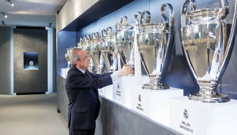 En el clip se ve al presidente del club merengue tomado el trofeo con ambas manos y colocándolo junto a los 14 restantes, los cuales brillan en el museo del ‘Santiago Bernabéu’.