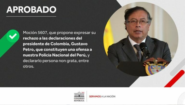 El Congreso de Perú declaró persona non grata al presidente de Colombia, Gustavo Petro, en rechazo a sus declaraciones contra la Policía Nacional del Perú (PNP) y pidieron a las autoridades que garanticen que «no ingrese al territorio nacional».