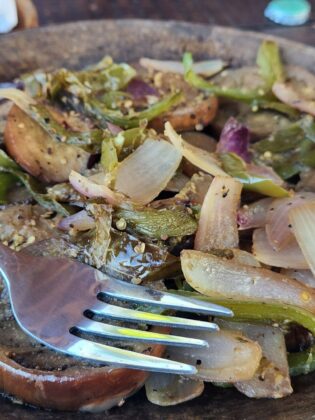 «La berenjena la cortamos en rebanadas, luego la ponemos a gratinar, le ponemos la salsa que preparamos aquí en casa. Luego se le pone el queso mozzarella, chile, tomate y cebolla. Después se deja por unos cinco minutos para que se termine de gratinar para servirla al cliente», explicó una de las cocineras.