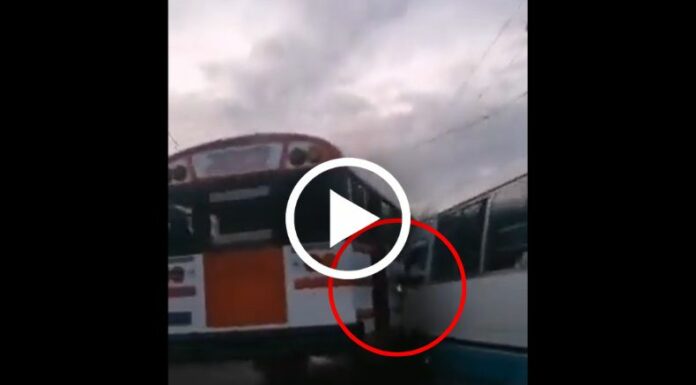 A través de las redes sociales, circuló un video donde se puede apreciar como un autobús y microbús se detienen justo a la par del otro, sin dejar pasar a los automóviles que vienen detrás de ellos. Al parecer, ambos conductores se encuentran discutiendo. De pronto, se puede observar cómo el bus sigue su camino, pero busca pegarle a la otra unidad de transporte colectivo, hasta llegar al punto de botar la parrilla delantera de la «coaster».
