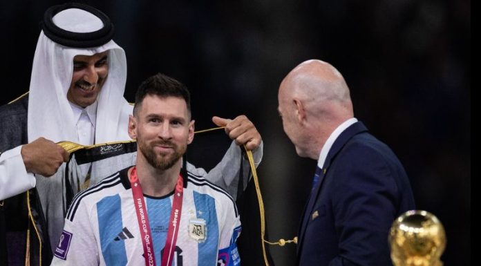 Antes, cada uno de los jugadores de la albiceleste fue llamado para subir al podio. El capitán salió de último y al tener la copa a escasos centímetro le brindó un enorme beso. Se acercaba el momento de alzarla. Todo el mundo se encontraba a la expectativa. Segundos antes fue detenido por Gianni Infantino (presidente de la FIFA) y por Tahim bin Hamad Al Thani (emir de Qatar). El jeque lo paró en seco, mejor que cualquier defensa francés durante la final, porque le colocó un manto.