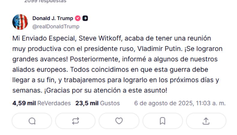 En la red Truth Social, Trump resaltó que su enviado especial tuvo “una reunión muy productiva. ¡Se lograron grandes avances!”.