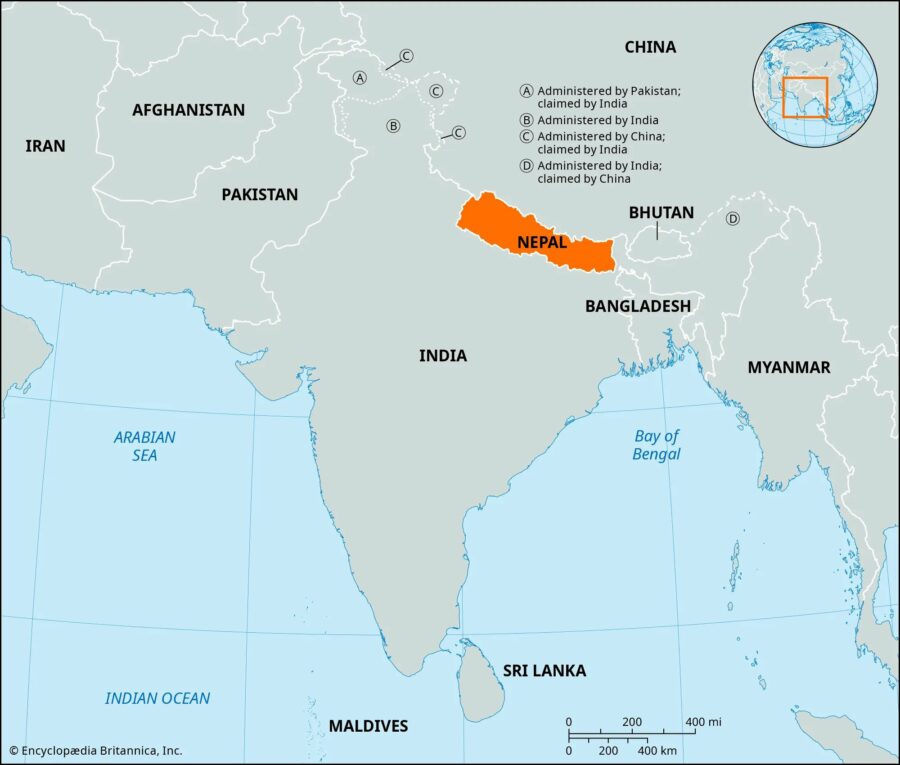 Nepal se ubica al sur de Asia, entre China (Tíbet) al norte e India al sur. Su territorio es de 147,181 kilómetros cuadrados. En buena parte es montañoso e incluye una franja de los Himalayas. Aquí está el Monte Everest, el punto más alto del planeta.